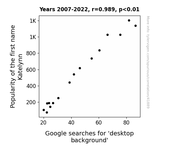 This means 97.9% of the change in the one variable (i.e., Google searches for 'desktop background') is predictable based on the change in the other (i.e., Popularity of the first name Katelynn) over the 16 years from 2007 through 2022.