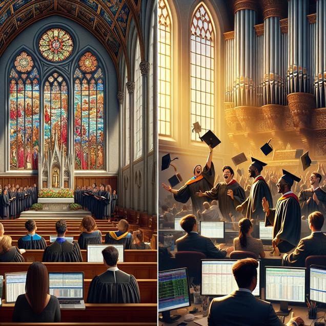 Prompt: Create a detailed, realistic image of a serene, sunlit chapel with stained glass windows and ornate pews. Within the chapel, a small group of graduates dressed in academic regalia receive their Bachelor's degrees in theology and religious vocations. The graduates beam with pride as they hold their degrees aloft. Concurrently, in a bustling brokerage office in Utah, show a group of brokerage clerks diligently at work. Their desks are equipped with computers and stock trading terminals. Depict the diminishing number of clerks amid the hustle and bustle, symbolizing the declining need for heavenly stock trades. The serene, spiritual scene of the chapel juxtaposed with the busy, secular setting of the brokerage office should evoke the unexpected interplay between the sacred and the secular in the economy. The depiction should include only scenes, people, and objects, it should not include text or speech bubbles.