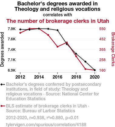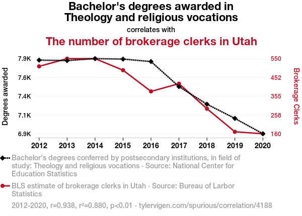 This means 88% of the change in the one variable (i.e., The number of brokerage clerks in Utah) is predictable based on the change in the other (i.e., Bachelor's degrees awarded in Theology and religious vocations) over the 9 years from 2012 through 2020.