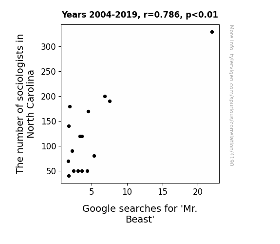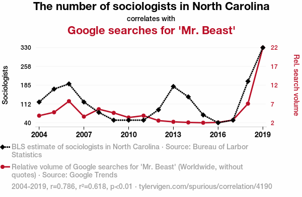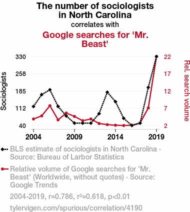 - The spurious research paper: The Sociological Search: Unearthing the Correlation Between Sociologists in North Carolina and 'Mr. Beast' Google Searches