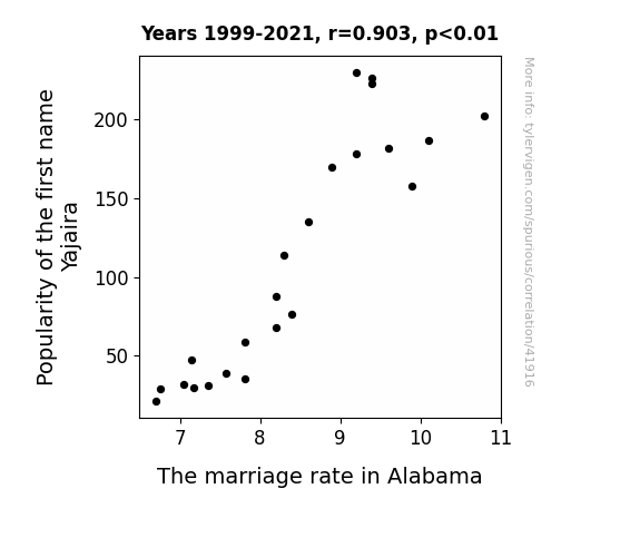 This means 81.5% of the change in the one variable (i.e., The marriage rate in Alabama) is predictable based on the change in the other (i.e., Popularity of the first name Yajaira) over the 23 years from 1999 through 2021.