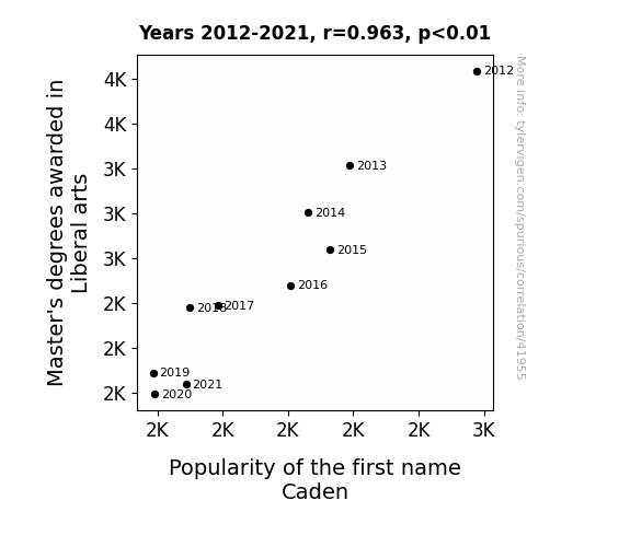 This means 92.7% of the change in the one variable (i.e., Popularity of the first name Caden) is predictable based on the change in the other (i.e., Master's degrees awarded in Liberal arts) over the 10 years from 2012 through 2021.