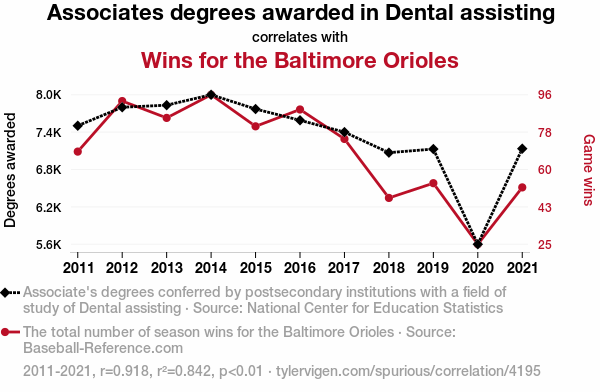 - The spurious research paper: Grin and Win: Investigating the Correlation Between Dental Assisting Associate Degrees and Baltimore Orioles' Victories