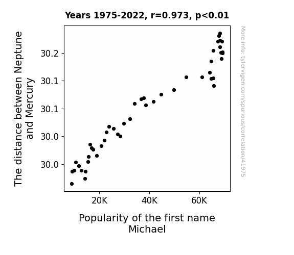 This means 94.7% of the change in the one variable (i.e., Popularity of the first name Michael) is predictable based on the change in the other (i.e., The distance between Neptune and Mercury) over the 48 years from 1975 through 2022.