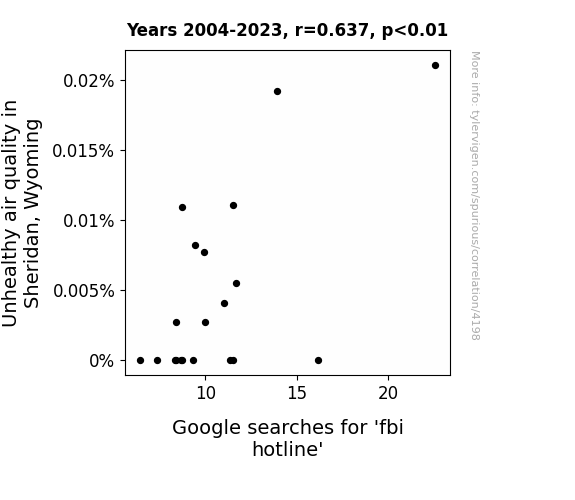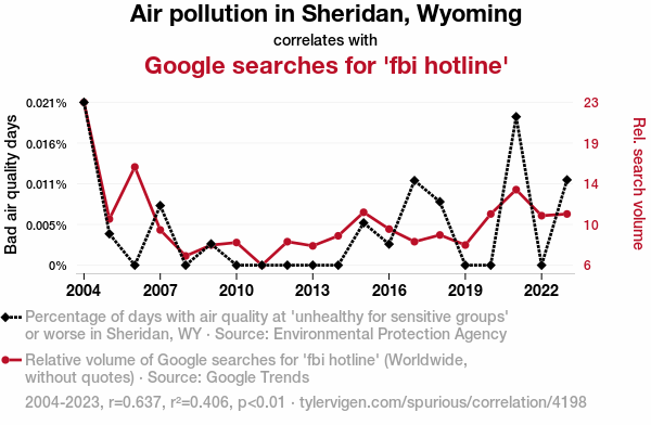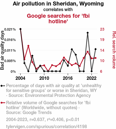 - The spurious research paper: Pollution Poses a Puzzling Predicament: Analyzing the Link Between Air Quality in Sheridan, Wyoming and Google Searches for 'FBI Hotline'