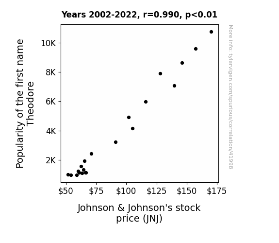 This means 98% of the change in the one variable (i.e., Johnson & Johnson's stock price (JNJ)) is predictable based on the change in the other (i.e., Popularity of the first name Theodore) over the 21 years from 2002 through 2022.