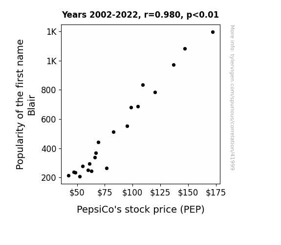 This means 96% of the change in the one variable (i.e., PepsiCo's stock price (PEP)) is predictable based on the change in the other (i.e., Popularity of the first name Blair) over the 21 years from 2002 through 2022.