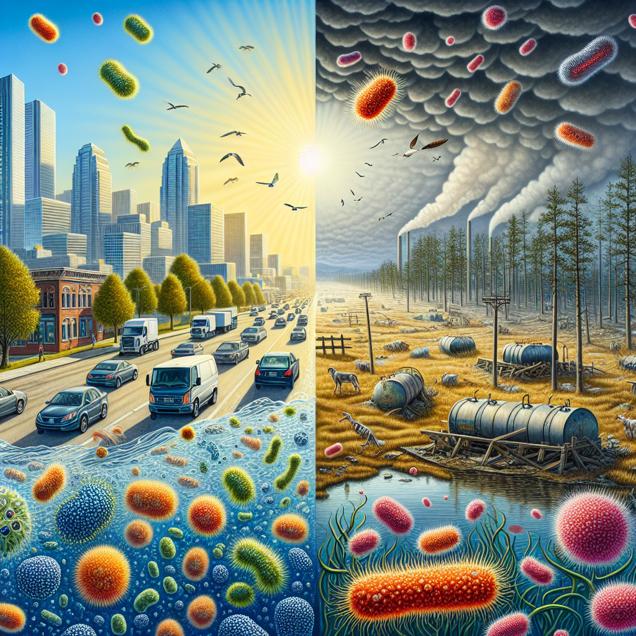 ChatGPT: Generate an image of a bustling cityscape with the sun breaking through the clouds in Reading, Pennsylvania. The skyline should show signs of air pollution dissipating, with clear blue skies and birds beginning to appear. In the foreground, depict a group of animated, colorful airborne microbes in search of a new food source, displaying distinctive characteristics that hint at their consumption of pollutants. In contrast, show a tranquil rural scene in Norway, with abandoned kerosene tanks and an environment untouched by pollution. The airborne microbes in Norway should be depicted as struggling and disoriented, highlighting their dependence on kerosene as a food source. The scene should evoke a sense of contrast and change as the natural world adapts to the reduction of pollution in Reading and the repercussions in Norway. The overall style should be hyper-realistic, with attention to detail in both environmental elements and the microbial characters.