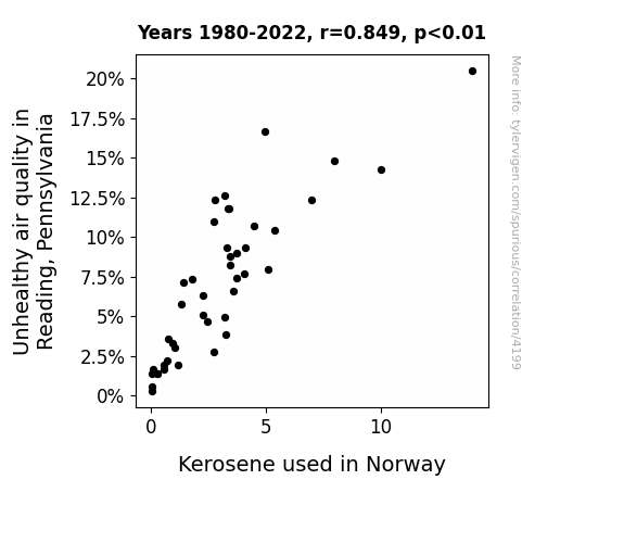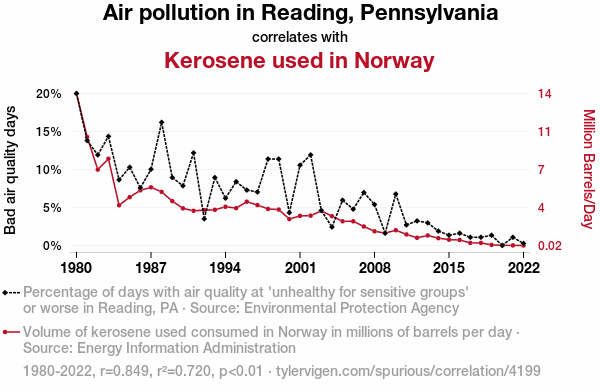 - The spurious research paper: Heating Things Up: The Sooty Relationship Between Air Pollution in Reading, Pennsylvania and Kerosene Consumption in Norway