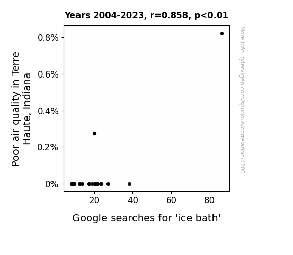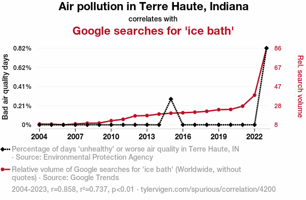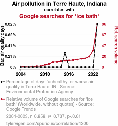 air pollution Terre Haute Indiana, Google searches, ice baths, Environmental Protection Agency data, correlation coefficient, Google Trends, air quality, public interest, climate data, statistical analysis