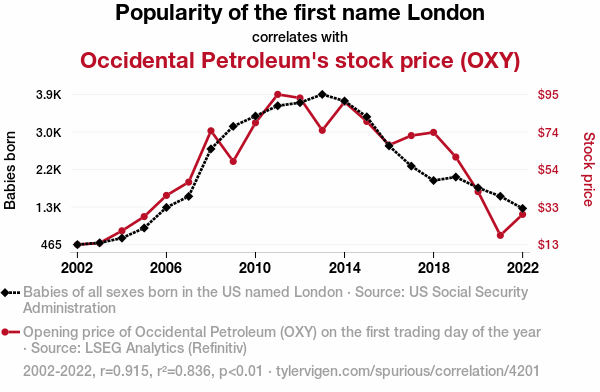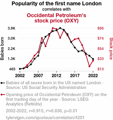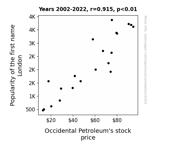 User prompt: Please provide potential search keywords for a paper titled The Oil and Babies: A Crude Connection between London Name Popularity and Occidental Petroleum's Stock Study with an abstract of The study examines the intriguing relationship between the popularity of the first name "London" and the stock price of Occidental Petroleum (OXY) from 2002 to 2022. Leveraging data from the US Social Security Administration and LSEG Analytics (Refinitiv), the research team uncovered a remarkable correlation coefficient of 0.9145199 and a p-value of less than 0.01. This substantial correlation suggests a striking connection between the two seemingly disparate entities, prompting us to ponder the extent of their underlying relationship.