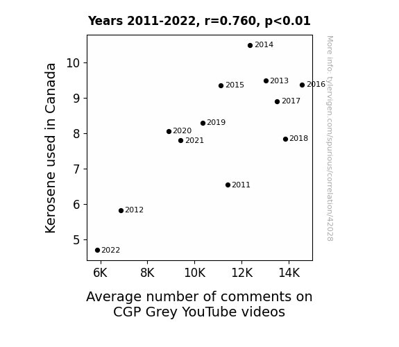 This means 57.7% of the change in the one variable (i.e., Average number of comments on CGP Grey YouTube videos) is predictable based on the change in the other (i.e., Kerosene used in Canada) over the 12 years from 2011 through 2022.