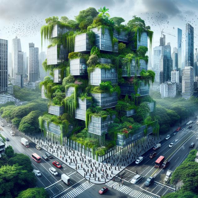 Prompt: Generate an image inspired by the scenario described as follows: In the center of the image, there is NatWest Group's headquarters, a modern and imposing building, overtaken by wild and overgrown greenery. The foliage cascades down from the rooftop, entwining around the building's structure and creeping into its windows. Surrounding the headquarters, we see chaos as employees attempt to fend off the unexpected plant invasion. The scene is juxtaposed with the bustling cityscape of New Jersey in the background. The visual narrative conveys the clash between the concrete jungle and uncontrolled nature, symbolizing the unforeseen impact of the dwindling forest workers on NWG's financial prospects. The depiction should include only scenes, people, and objects, it should not include text or speech bubbles.