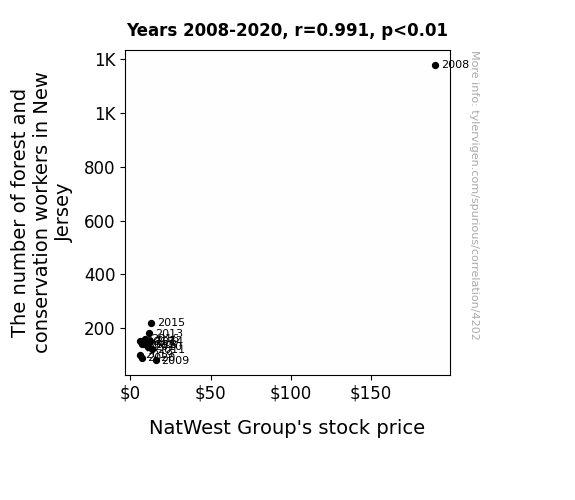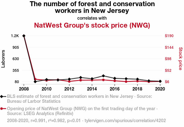 This means 98.2% of the change in the one variable (i.e., NatWest Group's stock price (NWG)) is predictable based on the change in the other (i.e., The number of forest and conservation workers in New Jersey) over the 13 years from 2008 through 2020.