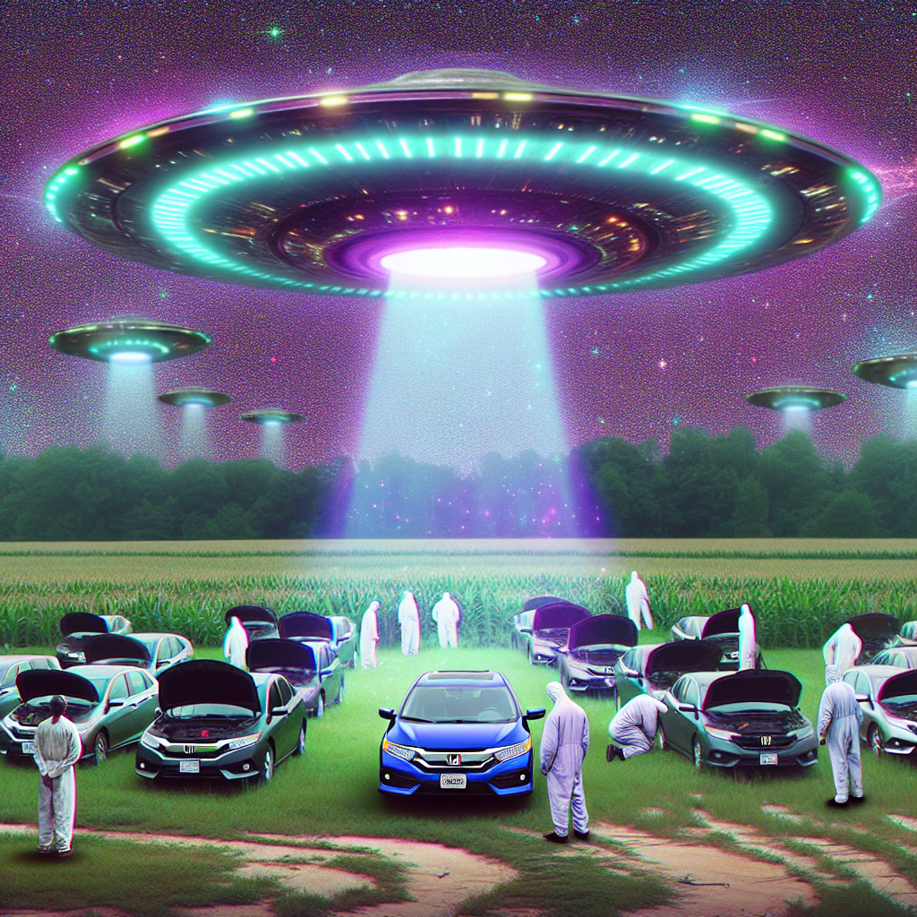 ChatGPT: In a field in Mississippi, UFOs can be seen hovering in the sky above a line of Honda cars. The UFOs emit a bright, otherworldly light while the Hondas sit still, their engines stalled due to the cosmic car-stalling ray. Mechanics from Honda are seen addressing the issue, with puzzled expressions as they try to figure out the otherworldly problem affecting their vehicles.