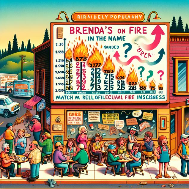 ChatGPT: Create an image where a quirky cartoon-style bulletin board outside a diner in a charming, quaint Oregon town is the focal point. The bulletin board is adorned with whimsical numbers representing the popularity of the name "Brenda" over the years. Delightful graphics symbolize the decrease in "Brenda's on fire" jokes, mirrored by a noticeable decline in the frequency of arson incidents in the town. As the visual narrative unfolds, the townspeople are depicted chuckling less about fire-related puns and engaging in community-wide fire safety efforts. The declining numbers and the amused townsfolk within the scene convey a sense of a town becoming a safer and less "sparky" place.