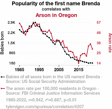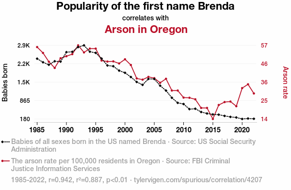 ChatGPT: In a small town in Oregon, a bulletin board outside the local diner displayed the popularity of the name Brenda over the years. As the number of "Brenda's on fire" jokes decreased, a noticeable decline in arson incidents was seen. The townspeople chuckled less about fire-related puns, and the community's fire safety awareness efforts were paying off. The numbers on the bulletin board and the decreased chatter about Brenas coincided with a decline in arson cases, leaving the town a little safer and a little less sparky.