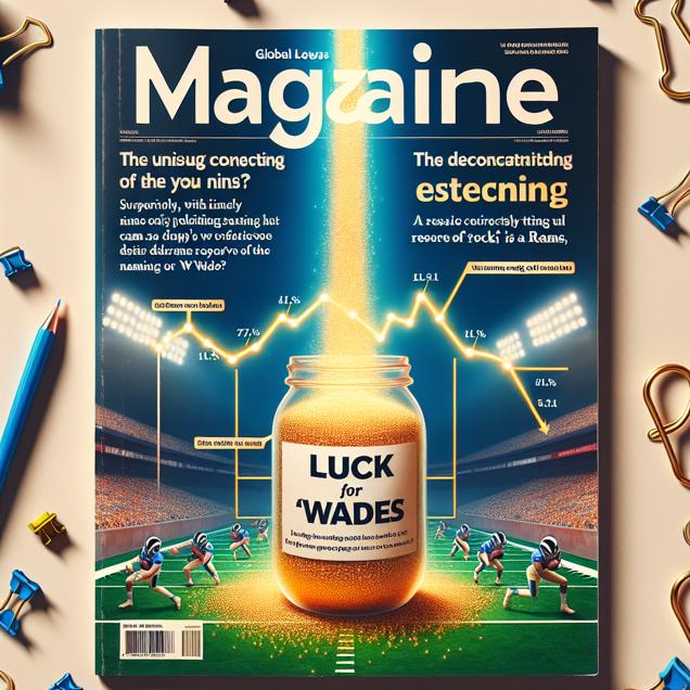 Prompt: An evocative image - a TIME magazine cover featuring a whimsical scene where a line graph depicts the declining popularity of the first name 'Wade'. As the line trends downward, tiny particles of luck flow from the chart, forming a golden stream into a jar labeled "Luck for Rams". In the background, a football field portrays the Los Angeles Rams navigating hurdles, symbolizing their decreasing season wins due to the shortage of serendipity from the diminishing number of Wades in the world. The depiction should include only scenes, people, and objects, it should not include text or speech bubbles.