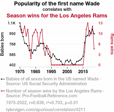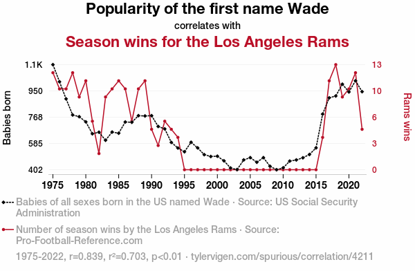 This means 70.3% of the change in the one variable (i.e., Season wins for the Los Angeles Rams) is predictable based on the change in the other (i.e., Popularity of the first name Wade) over the 48 years from 1975 through 2022.