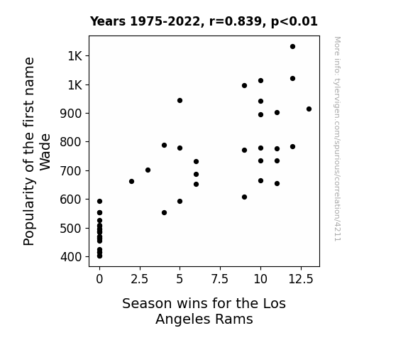 Now, imagine a world where the frequency of the name "Wade" becomes a whimsical predictor of the Los Angeles Rams' success on the gridiron. As absurd as it may sound, our initial analysis reveals a correlation coefficient that has statisticians raising their eyebrows higher than a touchdown field goal – and that's no small feat! We've crunched the numbers and uncovered a correlation coefficient of 0.8385980 with a significance level of p < 0.01, indicating that there might be more to this "Wade" business than meets the eye.