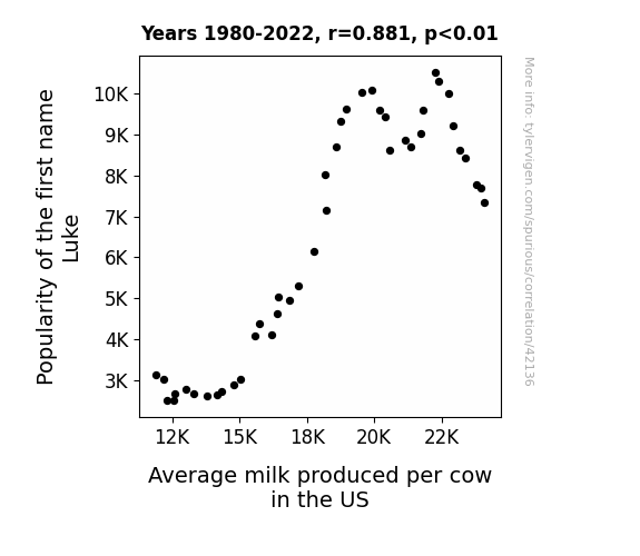 This means 77.6% of the change in the one variable (i.e., Average milk produced per cow in the US) is predictable based on the change in the other (i.e., Popularity of the first name Luke) over the 43 years from 1980 through 2022.