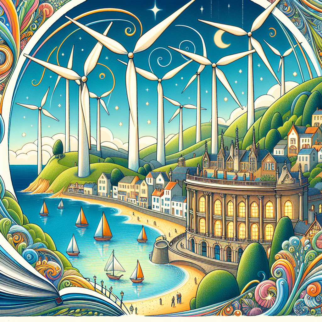 Prompt: [Whimsical illustration] A coastal town in Italy is depicted, where a row of elegant wind turbines stretches towards the sky, their graceful blades spinning in the gentle breeze. In the distance, across the sea in the UK, a charming public library stands with open doors, inviting a wave of new members to explore its literary treasures. The scene is filled with the harmonious symphony of nature and knowledge, as the sound of pages turning mingles with the soft rustle of the wind. The depiction should include only scenes, people, and objects, it should not include text or speech bubbles.