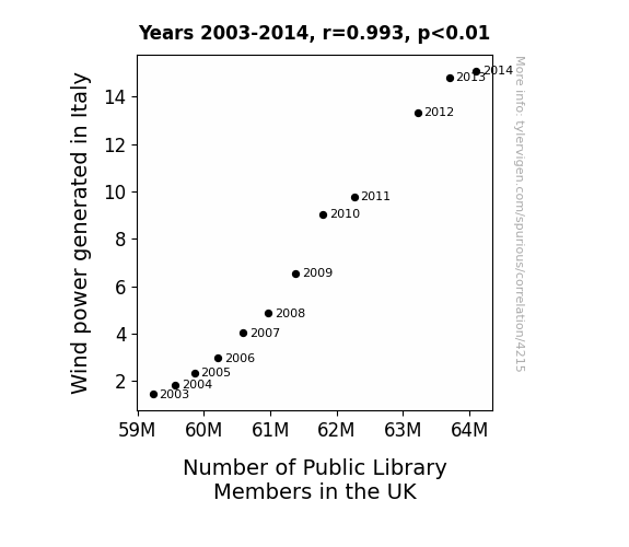 This means 98.5% of the change in the one variable (i.e., Number of Public Library Members in the UK) is predictable based on the change in the other (i.e., Wind power generated in Italy) over the 12 years from 2003 through 2014.