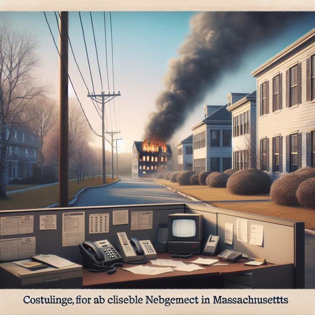 ChatGPT: Prompt: Generate a Polaroid photo of a quiet Massachusetts neighborhood with a smoldering building in the background, hinting at an arson attack. In the foreground, show the abandoned telemarketing office with empty cubicles and neglected equipment. The atmosphere should capture the aftermath of the fire and the sense of abandonment in the area.