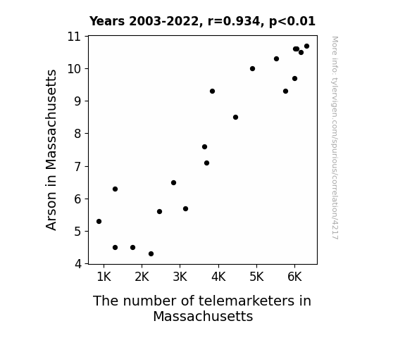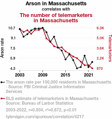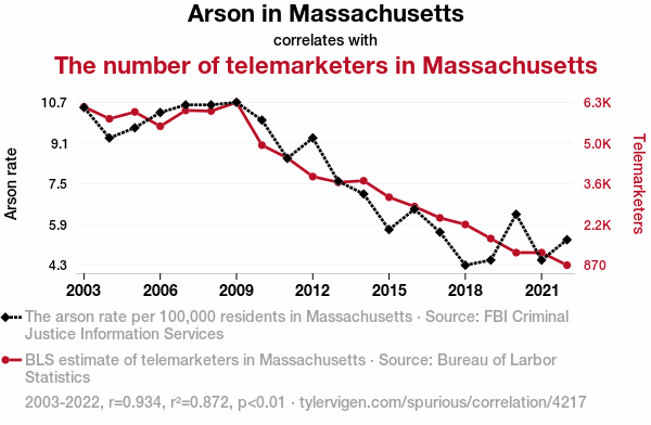 User prompt: Please provide potential search keywords for a paper titled Fanning the Flames: A Hotline to Arson? A Correlational Study of Arson in Massachusetts and the Number of Telemarketers with an abstract of This study delves into the intriguing relationship between the incidence of arson in the state of Massachusetts and the quantity of telemarketers operating within its borders. Leveraging data from the FBI Criminal Justice Information Services and the Bureau of Labor Statistics, our research endeavors to shed light on this unexplored correlation. Our findings reveal a remarkably robust correlation coefficient of 0.9337984, surpassing the typical threshold for statistical significance (p < 0.01) for the duration spanning 2003 to 2022. In this paper, we discuss the implications of this unexpected association, considering potential causative and confounding factors. While the link between telemarketers and arson may seem inconceivable at first blush, our results demonstrate that this peculiar relationship warrants further investigation and analysis.