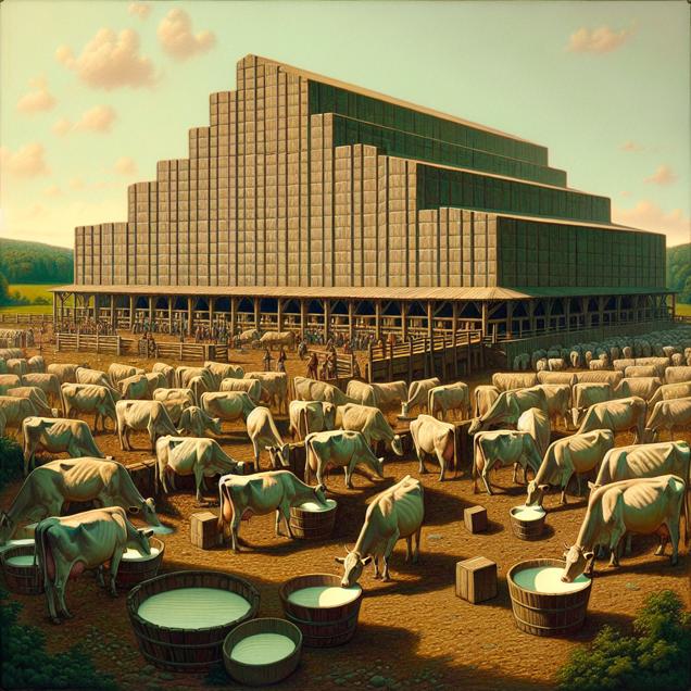 ChatGPT: Generate an image of a peaceful farmyard in the style of brutalism. Show a group of contented cows standing around a large, imposing barn filled with milk crates. The cows are sipping from buckets of milk while displaying an air of contentment. In the background, depict the nearby town where crime rates plummet as rival gangs of humans peacefully resolve their differences, with their weapons abandoned in favor of glasses of milk.