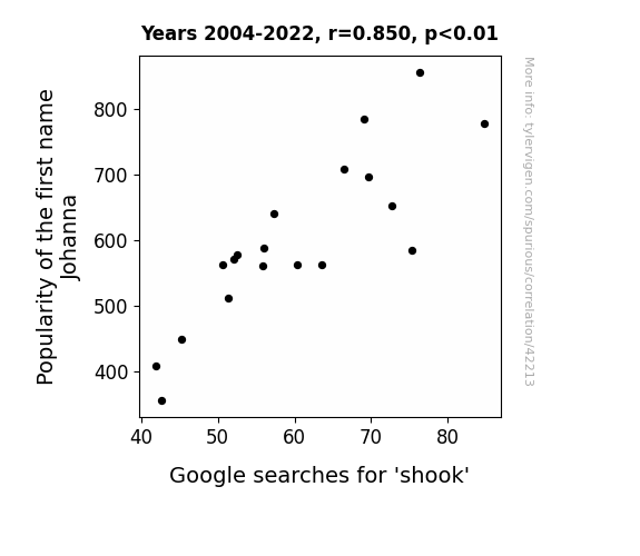 This means 72.2% of the change in the one variable (i.e., Google searches for 'shook') is predictable based on the change in the other (i.e., Popularity of the first name Johanna) over the 19 years from 2004 through 2022.