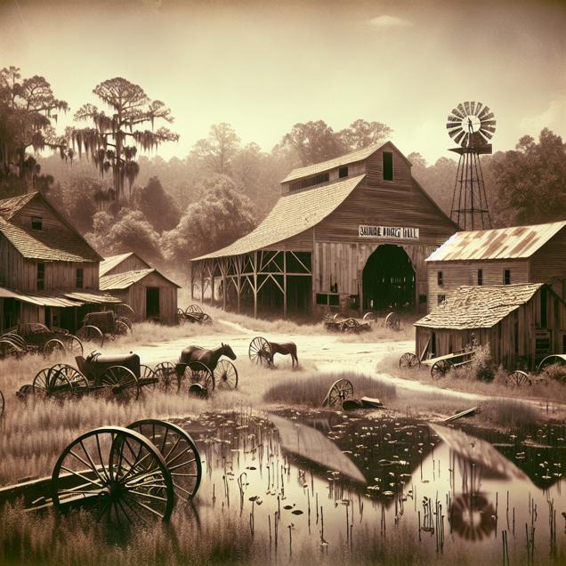 Prompt: Create an image of a rural South Carolina town where the once bustling farmlands and lively dance halls now sit empty and deserted. Show the abandoned agricultural equipment among the overgrown fields, with the dilapidated barns in the background. Capture the stillness and desolation of the scene, portraying the absence of joy and energy that once filled the town through the now-silent square dance halls. Let the despondent atmosphere convey the decline in happiness and productivity, eventually reflecting in the decrease in the annual growth rate of US Real GDP. The depiction should include only scenes, people, and objects, it should not include text or speech bubbles.