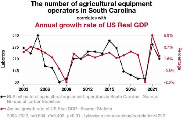 agricultural equipment operators, US Real GDP growth, South Carolina, correlation coefficient, economic impact, tractor operators, combine operators, agricultural sector, economic prosperity, crop cultivation, Bureau of Labor Statistics, Statista, annual growth rate