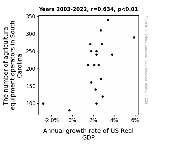 The analysis of the data revealed a remarkable correlation between the number of agricultural equipment operators in South Carolina and the annual growth rate of US Real Gross Domestic Product (GDP). Our statistical investigation unearthed a correlation coefficient of 0.6338357, indicating a moderately strong positive relationship between these variables. It seems that the engine power of agricultural equipment isn't the only thing driving growth – it's also propelling the nation's economic engine!