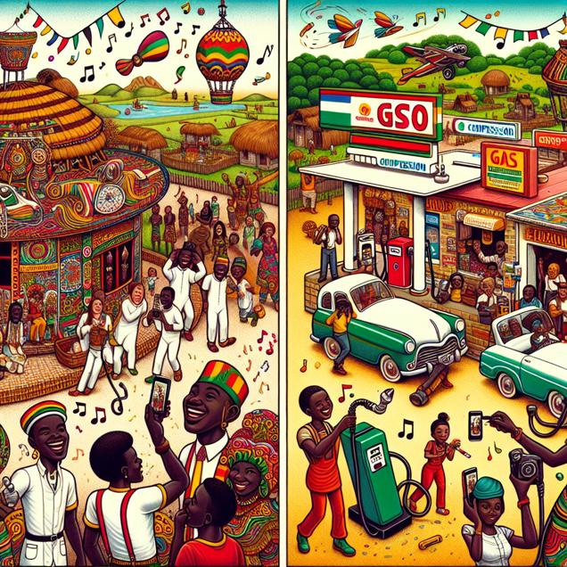 User prompt: Please describe a visual scene that prominently depicts both The number of gas compressor and gas pumping station operators in West Virginia and Petroluem consumption in Guinea-Bissau, in the following situation: The influx of gas compressor and gas pumping station operators in West Virginia has inadvertently sparked a global enthusiasm for all things gas-related. This has led to a surge in gas-themed social media influencers promoting lavish gas-guzzling lifestyles. As Guinea-Bissauans are captivated by this online gas frenzy, they have taken to using petroleum in unprecedented quantities, driven by a curious mix of fascination, admiration, and a sudden penchant for gas station selfies. This unexpected cultural shift has not only boosted petroleum consumption in Guinea-Bissau, but has also made 'pumping gas' the latest trending hobby, with local residents embracing it as the new national pastime!. Keep the description simple.