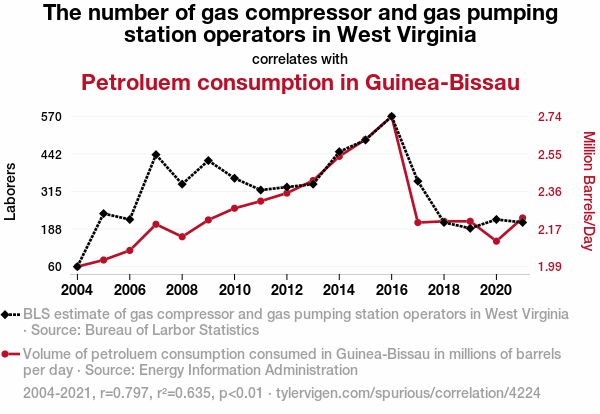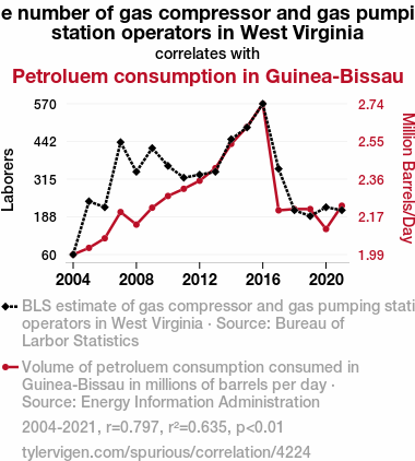 This means 63.5% of the change in the one variable (i.e., Petroluem consumption in Guinea-Bissau) is predictable based on the change in the other (i.e., The number of gas compressor and gas pumping station operators in West Virginia) over the 18 years from 2004 through 2021.