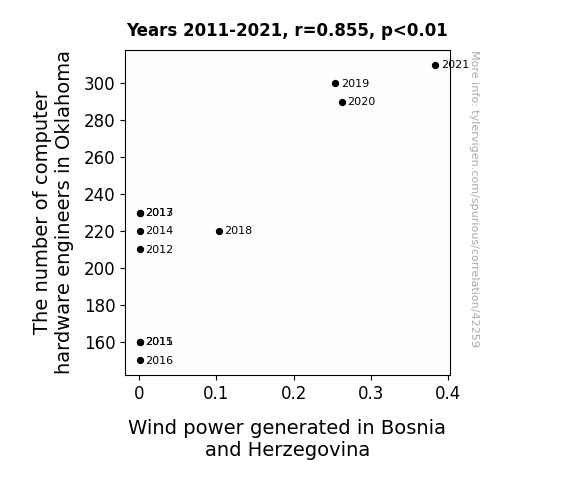 This means 73% of the change in the one variable (i.e., Wind power generated in Bosnia and Herzegovina) is predictable based on the change in the other (i.e., The number of computer hardware engineers in Oklahoma) over the 11 years from 2011 through 2021.