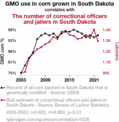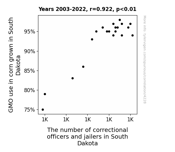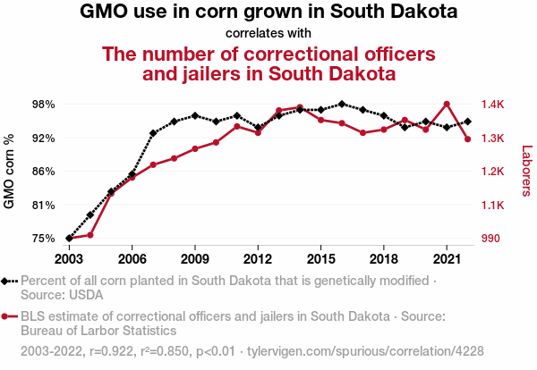 This means 85% of the change in the one variable (i.e., The number of correctional officers and jailers in South Dakota) is predictable based on the change in the other (i.e., GMO use in corn grown in South Dakota) over the 20 years from 2003 through 2022.
