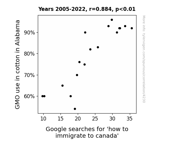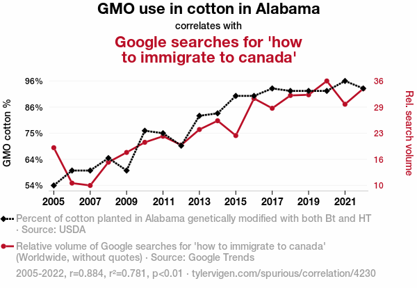 This means 78.1% of the change in the one variable (i.e., Google searches for 'how to immigrate to canada') is predictable based on the change in the other (i.e., GMO use in cotton in Alabama) over the 18 years from 2005 through 2022.