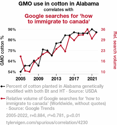 GMOs, genetically modified organisms, cotton farming, Alabama, Google searches, immigrate to Canada, correlation, USDA data, Google Trends, agricultural technology, human behavior, decision-making, technological adaptation, societal concerns, research, humor, agriculture, human aspirations, global interests, statistical significance