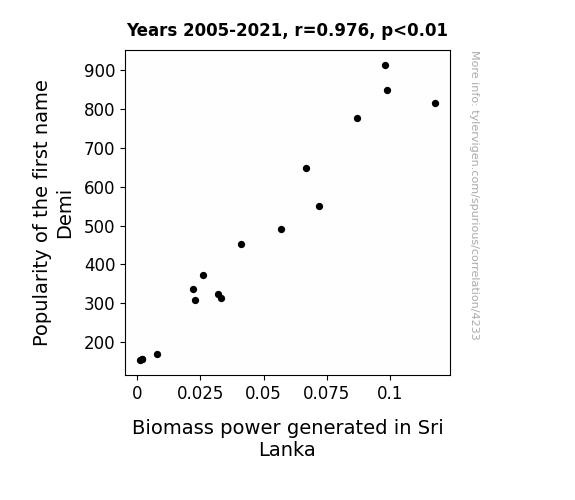 This means 95.2% of the change in the one variable (i.e., Biomass power generated in Sri Lanka) is predictable based on the change in the other (i.e., Popularity of the first name Demi) over the 17 years from 2005 through 2021.