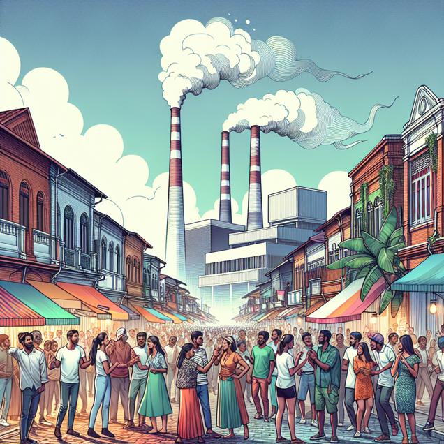 Prompt: Generate an image that embodies the cover of TIME magazine, featuring a bustling street in Sri Lanka with a vibrant energy. The scene should show a growing number of people named Demi gathering and socializing, creating a lively and popular atmosphere. In the background, towering biomass power plants should hum with activity, emitting clean white smoke to symbolize the surge in sustainable energy generation in response to the increasing popularity of the name Demi. The overall atmosphere should convey a sense of community, sustainability, and dynamic growth. The depiction should include only scenes, people, and objects, it should not include text or speech bubbles.