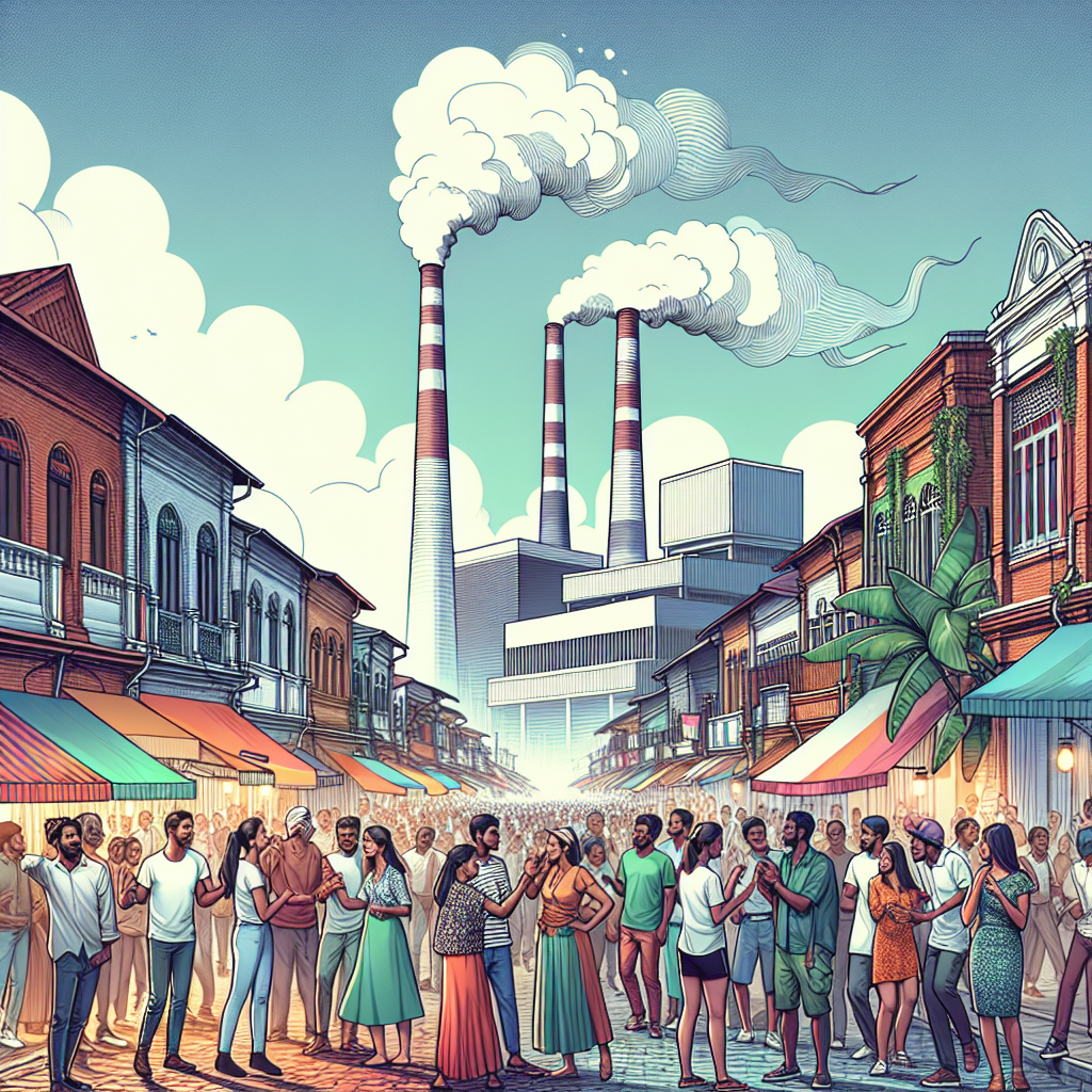 User prompt: Please respond with an image generation prompt that would be likely to create an interesting visual using DALLE-3, using the following style: [ A TIME magazine cover image ] and depicting this scene: A bustling street in Sri Lanka with a vibrant energy, where a growing number of people named Demi gather and socialize, creating a lively and popular atmosphere. In the background, towering biomass power plants hum with activity, their chimneys emitting clean white smoke, symbolizing the surge in sustainable energy generation in response to the increasing popularity of the name Demi. Keep the visual depiction simple. Do not include any words or speech bubbles.