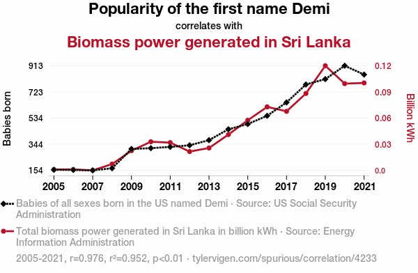 This means 95.2% of the change in the one variable (i.e., Biomass power generated in Sri Lanka) is predictable based on the change in the other (i.e., Popularity of the first name Demi) over the 17 years from 2005 through 2021.