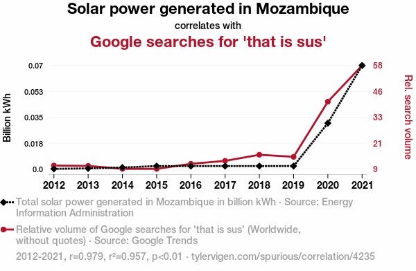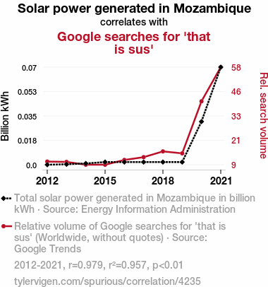 This means 95.7% of the change in the one variable (i.e., Google searches for 'that is sus') is predictable based on the change in the other (i.e., Solar power generated in Mozambique) over the 10 years from 2012 through 2021.
