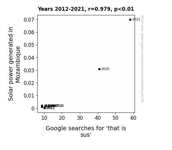 The analysis of the relationship between solar power generation in Mozambique and Google searches for the phrase 'that is sus' revealed a remarkably strong correlation. The correlation coefficient of 0.9785151 and an r-squared value of 0.9574918 indicate an exceptionally tight relationship between these seemingly unrelated phenomena, not unlike the tight embrace of a solar panel in need of some light refreshment. In line with this, the p-value of less than 0.01 suggests that this association is highly statistically significant, much like the gravity of a celestial body pulling in dad jokes.
