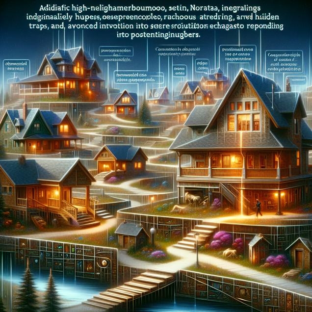ChatGPT: Create an image of a neighborhood in North Dakota filled with architect-designed houses, each featuring hidden traps and high-tech security features to thwart potential break-ins. The houses should be unique and visually interesting, showcasing the creativity and expertise of the architects in implementing security measures. The scene should reflect the growing trend of personalized, fortified homes in response to the surge in burglaries, with an emphasis on the intricate and futuristic security systems integrated into the architecture. The style of the image should be reminiscent of a scene from Skyrim, with a focus on detailed, fantasy-inspired visuals that capture the imagination.
