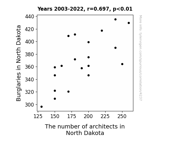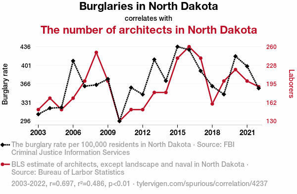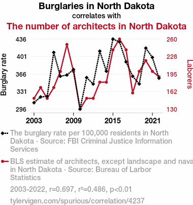 - The spurious research paper: Breaking and Building: The Correlation Between Burglaries in North Dakota and the Number of Architects