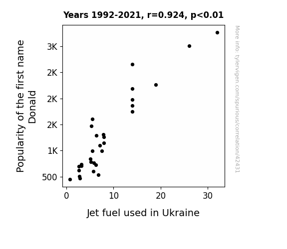 This means 85.4% of the change in the one variable (i.e., Jet fuel used in Ukraine) is predictable based on the change in the other (i.e., Popularity of the first name Donald) over the 30 years from 1992 through 2021.