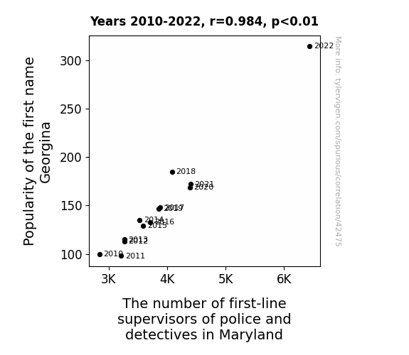 This means 96.7% of the change in the one variable (i.e., The number of first-line supervisors of police and detectives in Maryland) is predictable based on the change in the other (i.e., Popularity of the first name Georgina) over the 13 years from 2010 through 2022.